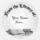Dieser runde Aufkleber mit individuellem Buchzeichen hat Platz für Ihren Namen in schwarzer Schrift und Vintager Bücherkunst und eine alte Feder, die auf einem graugrauen Hintergrund von Imitaten quill in antiken geätzten Künsten schreibt. Die Oberseite liest aus der Bibliothek der alten englischen gotischen Buchstaben. Oder passen Sie diesen Aufkleber an, um Schriftart oder Hintergründe zu verändern, sogar Ihr Design für später retten.