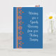 Eine hübsche Get Well Card für jemanden, der eine Kidney-Operation hat, mit einem Randmuster aus Orange, Rosa und Blauen Blumen und einem Rangoli-Motiv, aus einer handbemalten Papiercollage von Judy Adamson. Teil der Posh & Painterly 'Rangoli' Kollektion.