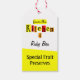 Ein Tag, der "From the Kitchen of" mit knackigen und niedlichen schwarzen Buchstaben gegen Farbblöcke in Rot, Orange und Gelb liest.