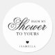 Elegantes Typografie-Brautparty bevorzugt Aufkleber mit einem einfachen Design mit der Meldung "From My Shower To Yours" in schwarzer Kalligraphie und Serif-Schriftart auf weißem Hintergrund. Unten ist ein Herz und Ihr Name. Die Schriftart und Hintergrundfarben können beliebig verändert werden. Diese extravaganten und stilvollen Aufkleber sind ein guter Weg, um Ihren Favoriten eine persönliche Touch hinzuzufügen.