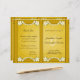 Rustikale goldene Blüte © Sunny Mars Designs. Einzigartig formelle, vollständig anpassbare Vintage rostig-blaue, elegante und faltbare Hochzeitsvorlage mit goldenen Farbbandrahmen, moderne hübsche Blume auf dem Hintergrund alter Pergamentpapiere.