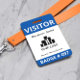 Doppelseitiges Abzeichen mit schlichtem Design in Blau und Weiß. VISITOR ist in fett weißen Buchstaben auf blauem Hintergrund geschrieben, um leicht sichtbar zu sein. Fügen Sie Ihren Firmennamen, Ihr Logo und Ihre Zweigniederlassung hinzu. Ganz unten die Abzeichen-Nummer.