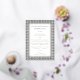 Rechteckige Hochzeitsmenüvorlage mit einem Folienrand in Ihrer Wahl aus Gold, Silber oder Rose. Schwarzer Text wird über eine weiße Tafel mit dünnen Linien und einem eleganten Muster gedruckt. Das gleiche Design trägt auf der Rückseite der Karten, ohne den Foliendruck. Nur der Rand wird eine Folie sein.