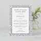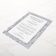 Rechteckige Hochzeitmenü Vorlage mit silberfarbenem Rand. Der graue Text wird auf einem weißen, geometrisch geformten Fenster gedruckt, das als Folienelement dieser Karte dient. Das Gegenteil ist massiv grau. Nur der Rand wird als Folie angezeigt und Sie können ihn in Gold oder Rose umtauschen.
