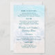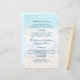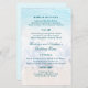 Hochzeitsmenü mit Meeresstrand. Hellblaues Wasser, Meeresschaum und Strand-Sand sind der Hintergrund für aquamarinen, maßgeschneiderten, blauen Text. Die Namen der Braut und des Bräutigams sind in der Mitte der Zeitung. Stellen Sie vier Bereiche mit Menüinformationen ein.