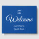 Auf der Vorderseite dieses blauen Gästebuches befinden sich drei Zeilen weißen Textes, den Sie bearbeiten können, um eine benutzerdefinierte Nachricht zu erstellen (Shown: Welcome Event Name Guest Book). Die zweite Zeile des Anzeigetextes erscheint auch auf der Wirbelsäule. Das Blau ist der Hexenfarbcode #004095.