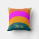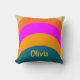 Orangefarbene, blaue und magentafarbene Bögen stehen auf diesem Kissen. Diese Retro-Farbpalette wurde in den 70er Jahren inspiriert. Eine Zeile mit Anzeigetext befindet sich am Ende für einen Namen oder Ihre benutzerdefinierte Nachricht.