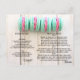 Macarons Rezept Postkarte mit einem hübschen Bild von bunten Makaronen mit rosa Rosen. Sie können den vergoldeten Happy Oaster Text löschen, wenn Sie ihn nicht benötigen, und Ihr eigenes Rezept auf der Rückseite hinzufügen.