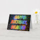 Dieses lebendige, bunte und lustige Geburtstagskarten-Design beinhaltet die Nachricht "HAPPY BIRTHDAY" und den gemeinsamen Vornamen "DAMIAN" mit den Buchstaben mit einem farbenfrohen Regenbogenspektrum wie Farbverlauf. Der Hintergrund der Vorderseite weist auch ein farbenfrohes Muster auf, das durch das Aussehen von berstenden feierlichen Feuerwerken inspiriert wird. Im Inneren befindet sich eine personalisierte Begrüßungsnachricht, oder man könnte sie löschen und leer verlassen werden, wenn eine Nachricht von Hand geschrieben werden soll. Eine Geburtstagskarte wie diese könnte eine lustige Art sein, eine individuell anpassbare Geburtstagsgrüßbotschaft an jemanden namens Damian zu senden. [~Z0000350]