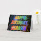 Dieses bunte und lustige Geburtstagskartendesign beinhaltet die Nachricht "HAPPY BIRTHDAY" und den gemeinsamen Vornamen "GIANNA" mit den Buchstaben, die ein farbenfrohes Regenbogenspektrum wie Farbverlauf haben. Der Hintergrund der Vorderseite weist auch ein farbenfrohes Muster auf, das durch das Aussehen von berstenden feierlichen Feuerwerken inspiriert wird. Im Inneren befindet sich eine personalisierte Begrüßungsnachricht, oder man könnte sie löschen und leer verlassen werden, wenn eine Nachricht von Hand geschrieben werden soll. Das könnte ein lustiger Weg sein, den Geburtstag von jemandem namens Gianna zu würdigen. [~Z0000350]