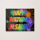 This vibrant and lively birthday-themed jigsaw puzzle design has the message "HAPPY BIRTHDAY, JASMINE" having a colorful rainbow spectrum inspirred gradient pattern, and an exciting bursting celebratory fireworks inspirred background pattern. An exciting puzzle like this might be a fun way to send birthday wishes to somebody named Jasmine. [~ Z0000465]