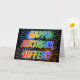Dieses lebendige, bunte und lustige Geburtstagskarten-Design beinhaltet die Nachricht "HAPPY BIRTHDAY" und den gemeinsamen Vornamen "JEFFERY" mit den Buchstaben mit einem farbenfrohen Regenbogenspektrum wie Farbverlauf. Der Hintergrund der Vorderseite weist auch ein farbenfrohes Muster auf, das durch das Aussehen von berstenden feierlichen Feuerwerken inspiriert wird. Im Inneren befindet sich eine anpassbare Grußmeldung, oder vielleicht kann gelöscht und links werden, wenn eine Nachricht von Hand geschrieben werden soll. Eine solche Grußkarte könnte eine lustige Art sein, eine personalisierte Geburtstagsbotschaft an jemanden namens Jeffery zu senden. [~Z0000350]