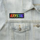 Dieses lustige, lebendige, mehrfarbige Namensschild-Design hat den gemeinsamen Vornamen "KRYSTAL", wobei die Buchstaben des Namens ein buntes Regenbogenspektrum wie Farbverlaufsmuster auf schwarzem Hintergrund haben. Ein Namensschild wie dieses könnte von einem Mitarbeiter, einem Mitarbeiter oder einem Freiwilligen getragen werden, dessen Name Krystal ist, um anderen zu helfen, den Träger zu identifizieren. [~Z0000344]