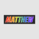 Dieses lustige, lebendige, mehrfarbige Namensschild-Design hat den gemeinsamen Vornamen "MATTHEW", wobei die Buchstaben des Namens ein farbenfrohes Regenbogenspektrum wie Farbverlaufsmuster auf schwarzem Hintergrund haben. Ein solches Namensschild könnte von einem Mitarbeiter, einem Mitarbeiter oder einem Kundendienstmitarbeiter namens Matthew getragen werden, um anderen zu helfen, den Träger zu identifizieren. [~Z0000344]