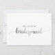 Diese einfache Silberfolie Kalligrafie Bridesmaid Vorschlagskarte ist perfekt für eine elegante Hochzeit. Das silberne funkelnde Design besticht durch eine schicke Typografie und ein luxuriöses metallisches Herz. Der Rücken ist leer, sodass Sie genug Platz haben, um eine nachdenkliche personalisierte Nachricht zu schreiben. Bitte beachten Sie: Dieses Design enthält keine echte Silberfolie. Es ist eine hochwertige Grafik, die wie Silberfolie aussieht.