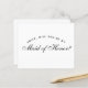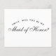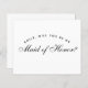 Ein einfaches, minimalistisches Trauzeugin-Angebot: Nur schwarzer Text auf weißem Hintergrund. Die Worte Trauzeugin auf der Vorderseite und die Nachricht auf der Rückseite sind in einem eleganten Kalligraphischen Skript geschrieben, der Bogentext "[Name] werden Sie mein" in kleinen Kappen.