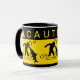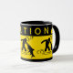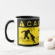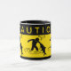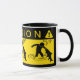 Gelbe und schwarze Warnschilder mit einem Fisch, der versucht, ein Strichmännchen zu essen.