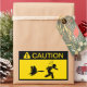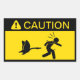 Gelbe und schwarze Vorsichtsschild mit einer Gans, die ein Strichmännchen jagt.
