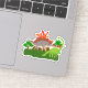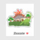 Ein Blatt mit 1 durchsichtigen Schalen aus Aufklebern, bestehend aus zwei herbivoren Dinosauriern, die auf Gras stehend sind, gerahmt von Cartoon-Bäumen und einem Vulkan im Hintergrund. Diese sind ideal für kleine Jungen, die Fantasie und prähistorische Tiere und Lebewesen Liebe.