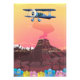 Ein Vintages blaues Propellerflugzeug, das tief über einem Vulkan fliegt.