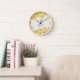 Eine Wanduhr mit Bienenmuster auf Honeycombs auf der Oberseite und auf der Unterseite und anpassbaren grauen und braunen Texten: perfekt für die Dekoration von Büros oder Zuhause. Sie können es auch dazu bringen, ein Geschenk an einen Imker, einen Bienenliebhaber, einen Naturfreund oder einfach nur für Ihre eigene Familie zu machen!