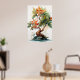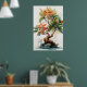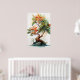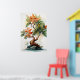 Die Wabi-Sabi Kunstdarstellung eines Baumes mit einem verdrehten Kofferraum liegt auf einer felsigen Oberfläche und zeigt lebendige, bunte Blätter. Der Hintergrund weist weiche, wasserfarbige Splashes auf, die der Szene eine ätherische Qualität verleihen.