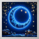 Whimsikale Nachtszene mit einem leuchtenden Halbmond, beleuchtet mit blauem Neonlicht. Von oben sind funkelnde Sterne, die eine magische Atmosphäre ausstrahlen. Im Vordergrund sollten die mit zartem Märchen geschmückten Steine sichtbar gemacht werden, was den zauberhaften Anblick verstärkt. Tiefe Blues und metallische Akzente rufen eine traumhafte Himmelslandschaft hervor.