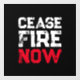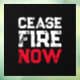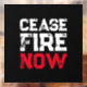 Waffenfeuer Jetzt weiß rot schwarz bedrückte Grunge Typografie Anti-Kriegsfenster Klammern Zeichen. Weiße und rote bedrückte fette Typografie auf schwarzem Hintergrund. Nahost/Gaza-Konflikt
