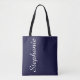 Diese trendy blaue und weiße personalisierte Taschenmitternachtstasche kennzeichnet Ihre Wahl des Farbhintergrundes und -namens in der riesigen modernen Typografie. Name ist nur auf einer Seite, falls Privatleben gewünscht wird. Ein elegantes Geschenk für Mitglieder Ihres Brautparty. Alle Rechte vorbehalten © Alan 2019 u. Marcia Socolik.