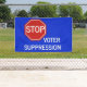 Unterbrechen Sie das Zeichen mit dem Text "Stopp Voter Suppression" auf dunkelblauem Hintergrund.