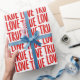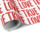 Zeigt ein schönes Muster mit den Wörtern "TRUE" und "LIEBE" in fett roten Großbuchstaben auf weißem Hintergrund. Die Wörter werden abwechselnd wiederholt, wodurch ein visuell auffälliges und romantisches Design entsteht.