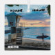Ein einzigartiges Geschenk oder Sake für den hawaiianischen Reisenden. Ein Turm für Rettungsschwimmer am Queen's Beach in der Abenddämmerung mit einer Person und Surfbrett. Waikiki und das Jahr können auf Wunsch geändert werden.