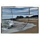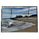 Sitzen am Strand im Abend und beobachten die nahenden Regenwolken über den Himmel ziehen. Die Meerestide kommt herein und die kleine Stadt Tywyn zeigt sich in der Ferne. Gwynedd Wales UK