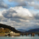 Blick vom Hafen Barmouth auf die Berge, die Mündung und die Eisenbahnbrücke. Wales UK.
