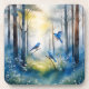 Ein wunderbares und fröhliches Set von Untersetzern. Ein schönes Bild mit drei Blaurücken in einem Wald mit weicher, nebliger Beleuchtung und einem Hauch von Surrealismus und/oder Fantasy.