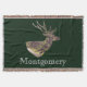 Ein schöner Wald überlagerte sich auf einer Profil-Silhouette eines Bucks über einem dunkelgrünen Hintergrund mit personalisiertem Familiennamen in weißem, offenem Text.