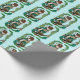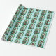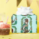 Ein rot haariger Elf, der einen Bogen und einen Pfeil hält, ist mit grünen Blätter vor blauem Hintergrund gerahmt
