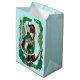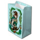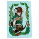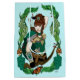Ein rot haariger Elf, der einen Bogen und einen Pfeil hält, ist mit grünen Blätter in einer blauen Umgebung gerahmt