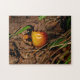 Ein orange-brauner Pilz sprießt vom Waldboden, umgeben von einer Fülle von braunen Blätter. Der Pilz und das nahe grüne Gras sind die einzige Farbe unter den toten Blätter. Wenn Sie Makrofotografie mögen, ist unser "Puzzle aus dem Wald, Puzzle aus Pilz" für Sie da. Bestelle noch heute!