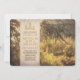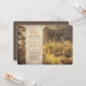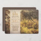 Rustikales Probe-Dinner mit schöner Waldlandschaft und Probe-Dinner Einladung Text auf der alten Holzbrett geschrieben. Romantische Einladung zum Probe-Dinner im Wald mit Fichten und anderen wilden Bäumen mit Lichtern.