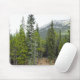 Dieses Mausunterlage-Ausrüstungsbeschreibungen ein Foto einer Waldszene mit Koniferenbäumen, zusammen mit einem Berg im Hintergrund.