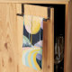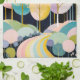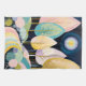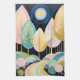 Ein etherisches und symbolisches Gemälde mit einer stilisierten, abstrakten Waldszene. Große teardrop-förmige Bäume mit Spindeln beherrschen die obere Hälfte der Leinwand, ihre Baldachine in sanften Rosa-, Türkis- und Goldtönen, einige mit schimmernden Goldblattdetails. Ein Himmelskörper, ein großer orb mit konzentrischen blauen, lila und gelben Ringen, hängt im tiefblauen Himmel. Der Vordergrund ist eine hügelige Landschaft mit abgerundeten Hügeln in verschiedenen Pastelln, durch die ein kurvenreicher, regenbogenfarbener Pfad führt. Der Gesamteindruck ist eine traumhafte, mystische Landschaft voller lebendiger Farben und geometrischer Formen.
