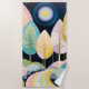 Ein etherisches und symbolisches Gemälde mit einer stilisierten, abstrakten Waldszene. Große teardrop-förmige Bäume mit Spindeln beherrschen die obere Hälfte der Leinwand, ihre Baldachine in sanften Rosa-, Türkis- und Goldtönen, einige mit schimmernden Goldblattdetails. Ein Himmelskörper, ein großer orb mit konzentrischen blauen, lila und gelben Ringen, hängt im tiefblauen Himmel. Der Vordergrund ist eine hügelige Landschaft mit abgerundeten Hügeln in verschiedenen Pastelln, durch die ein kurvenreicher, regenbogenfarbener Pfad führt. Der Gesamteindruck ist eine traumhafte, mystische Landschaft voller lebendiger Farben und geometrischer Formen.