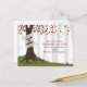 Eine Hochzeit speichert das Datum Postkarte mit einer Abbildung eines Baumes im Wald. Der Baum hat Blätter in verschiedenen Rottönen, sichtbare Wurzeln und einen Kofferraum, der mit Bannern umhüllt ist, die mit den Namen von Braut und Bräutigam angepasst werden können.