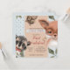Niedliche Waldtiere Marmoruhu und Fuchs mit Brille. Der Text ist auf einem rosa Hintergrund mit grauen Punkten und Blätter in der Rose. Die Einladung ist unisex