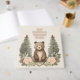 Dieses bezaubernde Walddesign besticht durch einen niedlichen braunen Bären, der von blütigen Blumen und Bäumen umgeben ist.