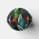 Ein schicker schwarzer Hintergrund. Der tropische Regenwald ist grün und blau, der Dschungel. Blätter aus Palmen und Bananen, Blattwerk mit roten und orangefarbenen Blumen, Blume. Ein schwarz-orangefarbener Rahmen mit Platz für Ihren Namen und Monogramm-Buchstaben. Der Name ist mit einem modernen handgeschriebenen Stilskript geschrieben.
