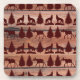 Waldelch-Wolf-Wildnis-Gebirgskabinen-rustikaler Dekor mit einem wiederholenden Muster der Elche, die heulenden Wölfe und die Kiefernbäume in einer kastanienbraunen roten Silhouette entwerfen. Der Hintergrund ist rustikale hölzerne Bretter, wie die Seite einer Kabine.