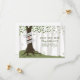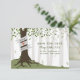 Eine Hochzeit im Freien speichert das Datum mit einer Abbildung eines Waldbaumes mit grünen Blätter und sichtbaren Wurzeln mit einem Banner, der um den Kofferraum für die Namen von Ehepaaren herum gewickelt ist.