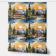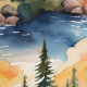 Aquarellkabine im Wald mit Pelzkiefern, Laufbach, Bergen und Sonnenuntergang.